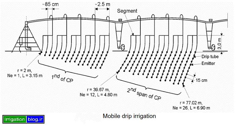 در این سیستم فاصله قطره چکانها روی لوله لترال ۱۲ اینچ و فاصله بین لترال ها از ۳۰ یا ۴۰ یا ۶۰ اینچ براساس نوع خاک می باشد٬ از مزایای این سیستم کارکرد آن با فشار ۵ تا ۱۰ متر است و دیگر اینکه مسیر حرکت چرخها هنگام حرکت خشک می ماند و گل درست نمی‌شود.